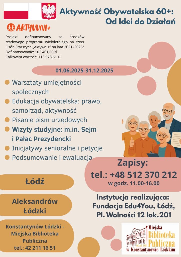 Cel projektu: Zwiększenie aktywności społecznej i obywatelskiej 84 seniorów z gmin: Łódź, Konstantynów Łódzki i Aleksandrów Łódzki poprzez rozwój umiejętności społecznych, edukację obywatelską oraz wzmocnienie ich zaangażowania w życie lokalnych społeczności w okresie od 1 czerwca do 31 grudnia 2025 roku.